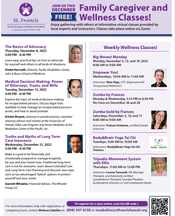 Another idea is to focus on what really matters. At 88, Clint Eastwood was asked, “How do you remain so young and active?” The now 92 y.o. Clint replied, “I don’t let the old man in.” Yep, tough mindset for sure. Some fight the frailty aspect of aging. Others just give in, saying c’est la vie. All I know is that life is unpredictable. In my practice, we discuss risks in retirement. Longevity happens to be one of them. Optimists will comment, what is wrong with living a long life? Nada. It is about addressing the risks if you choose. My partners at St. Francis Healthcare are sponsoring a FREE virtual LTCi educ session I am conducting tomorrow evening via Zoom. Join us. Here is the link to register: https://www.stfrancishawaii.org/s/courses
